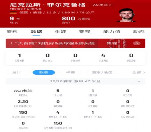 32岁的菲尔克鲁格冬窗租借加盟AC米兰,合同中包含可选择买断条款,买断费用为500万欧。他本月加盟米兰后,已为球队出场5次,贡献1球,他目前身价为800万欧。