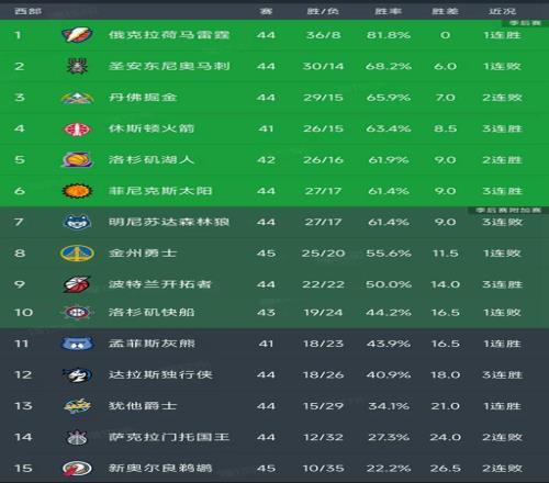北京时间1月21日,今日的NBA常规赛结束了所有比赛,我们看看西部球队的发挥和最新积分榜变动,主要的信息是:马刺106-111憾负火箭,掘金107-115被湖人逆转,勇士127-145惨败猛龙,森林狼122-127不敌爵士,太阳116-110战胜76人,快船110-138惨败公牛,国王117-130不敌热火。