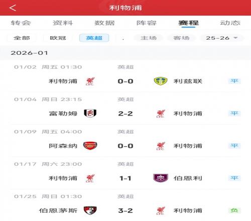 1月5场联赛0胜绩!利物浦本月英超4平1负,踢弱旅丢分被樱桃绝杀